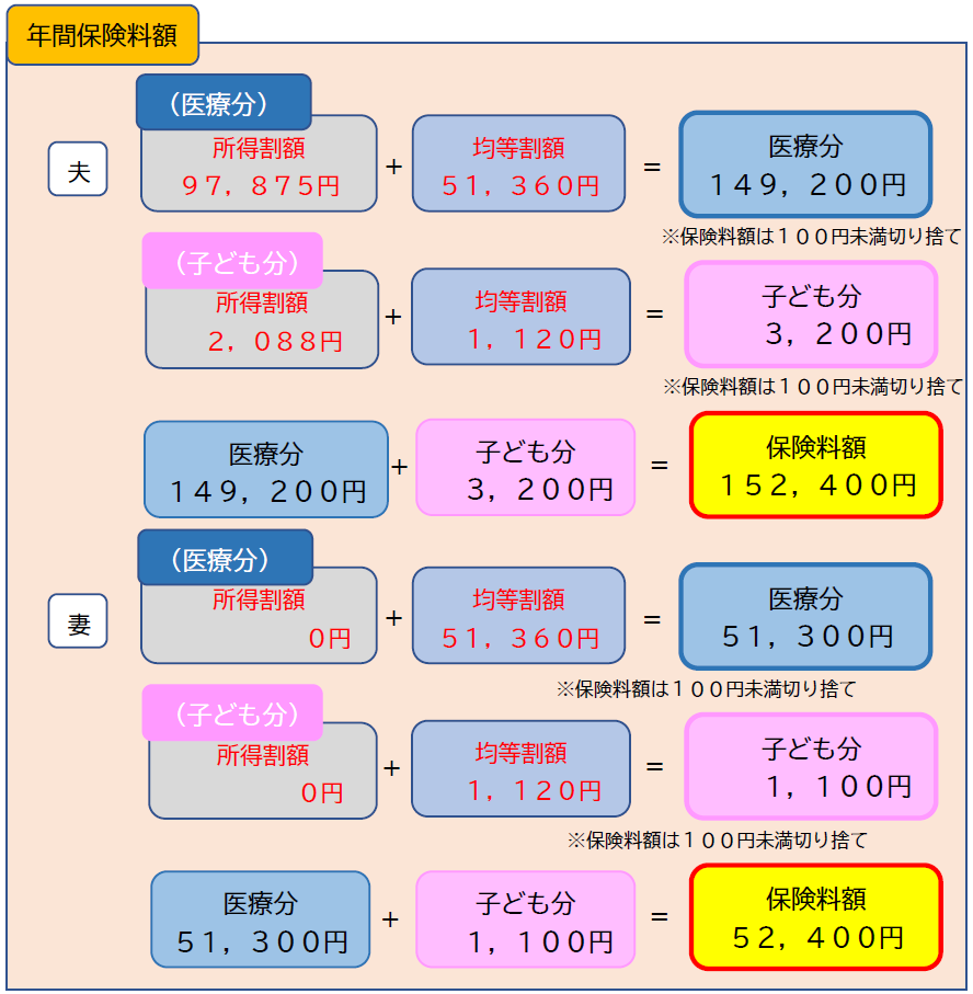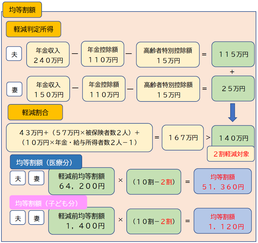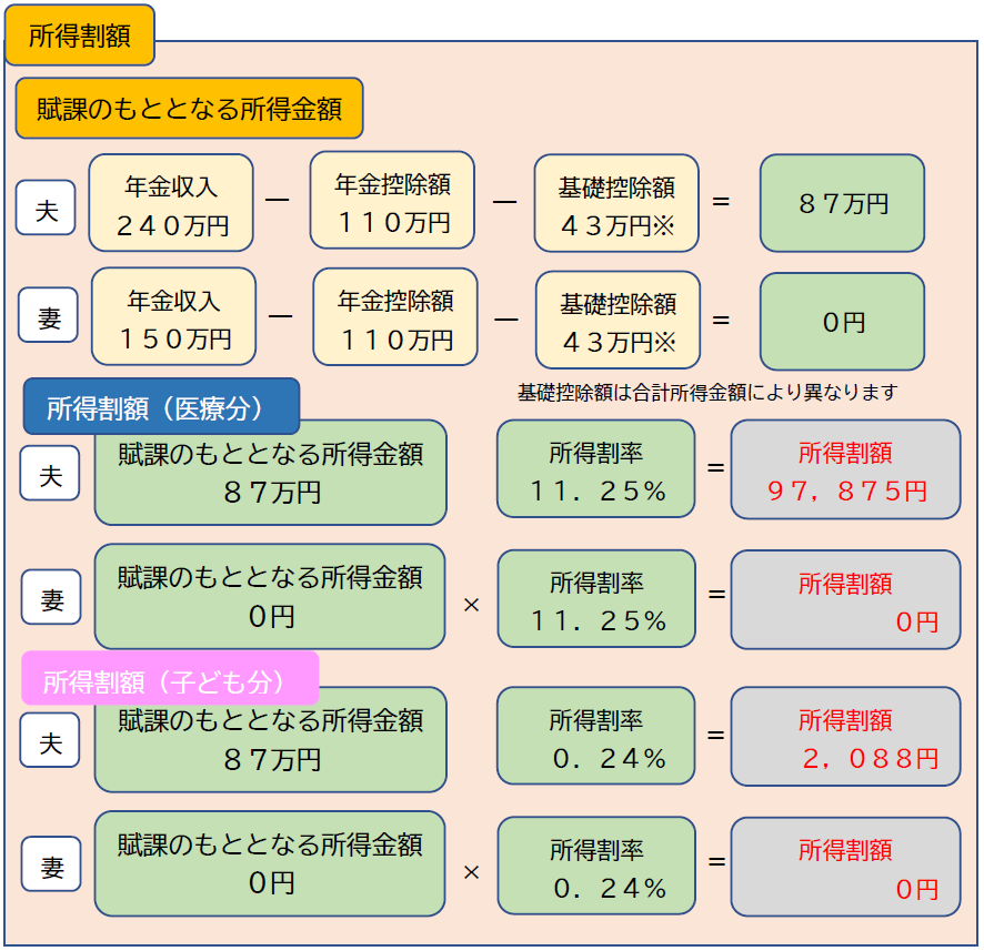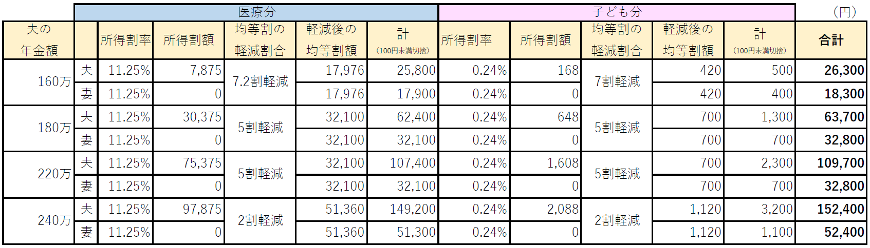 <夫婦2人世帯で共に被保険者である場合(夫の収入が年金収入240万円、妻の収入が年金収入150万円の場合)>